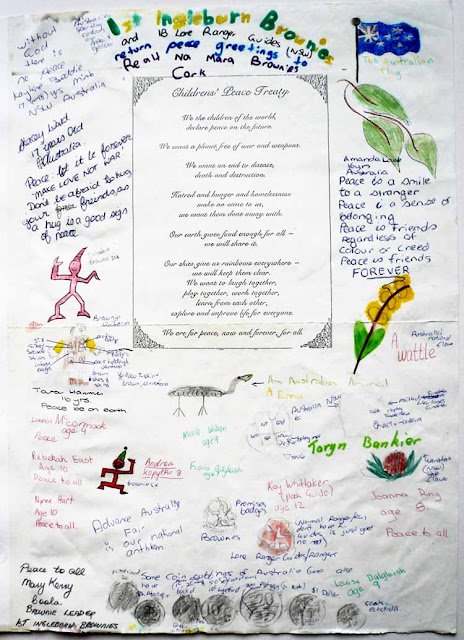 So I got all of my Brownies to draw a picture of something either related to Brownies or to Ireland, just a pencil outline drawing. They came up with some great pictures. I cut them out and made a collage of them around the treaty on a large sheet of paper A3 size..that's about 11.5in by 16in.